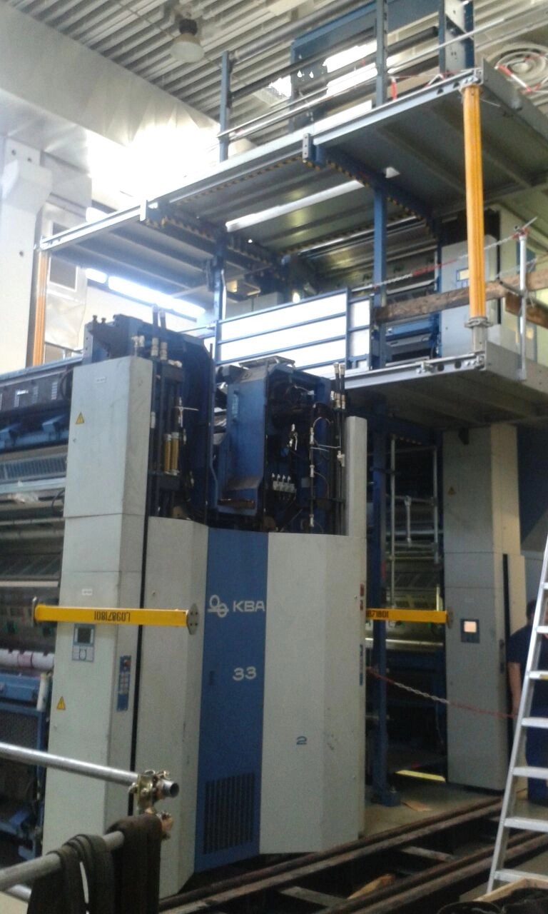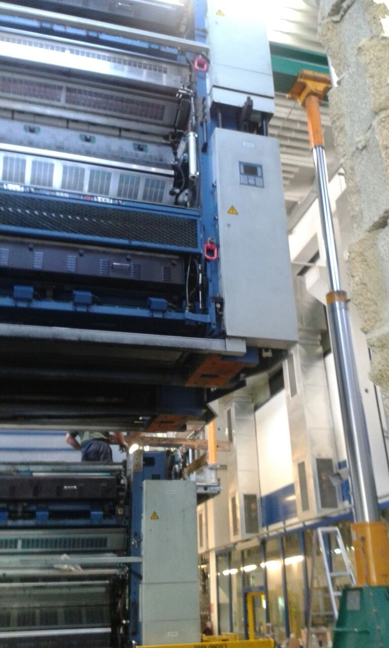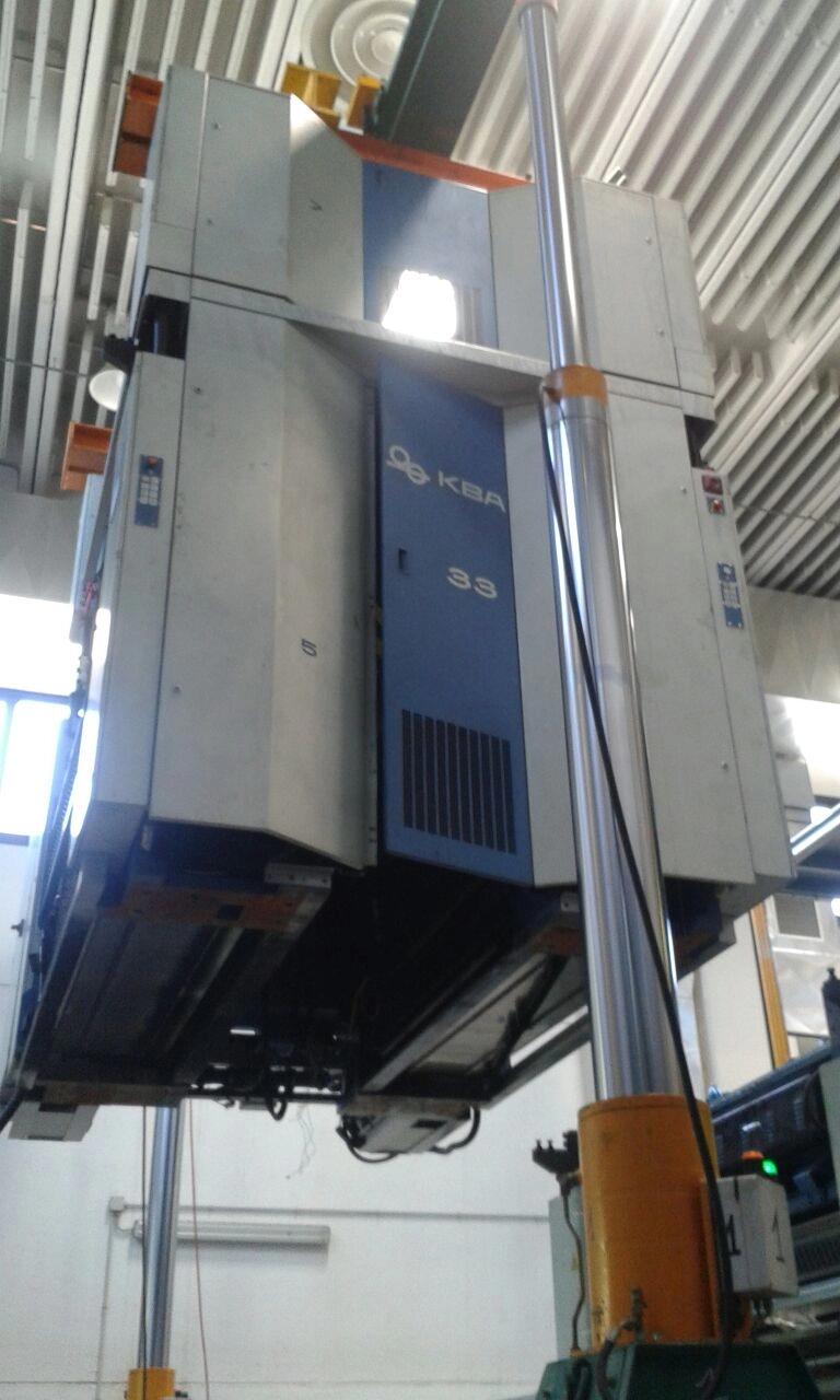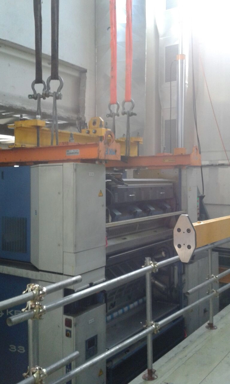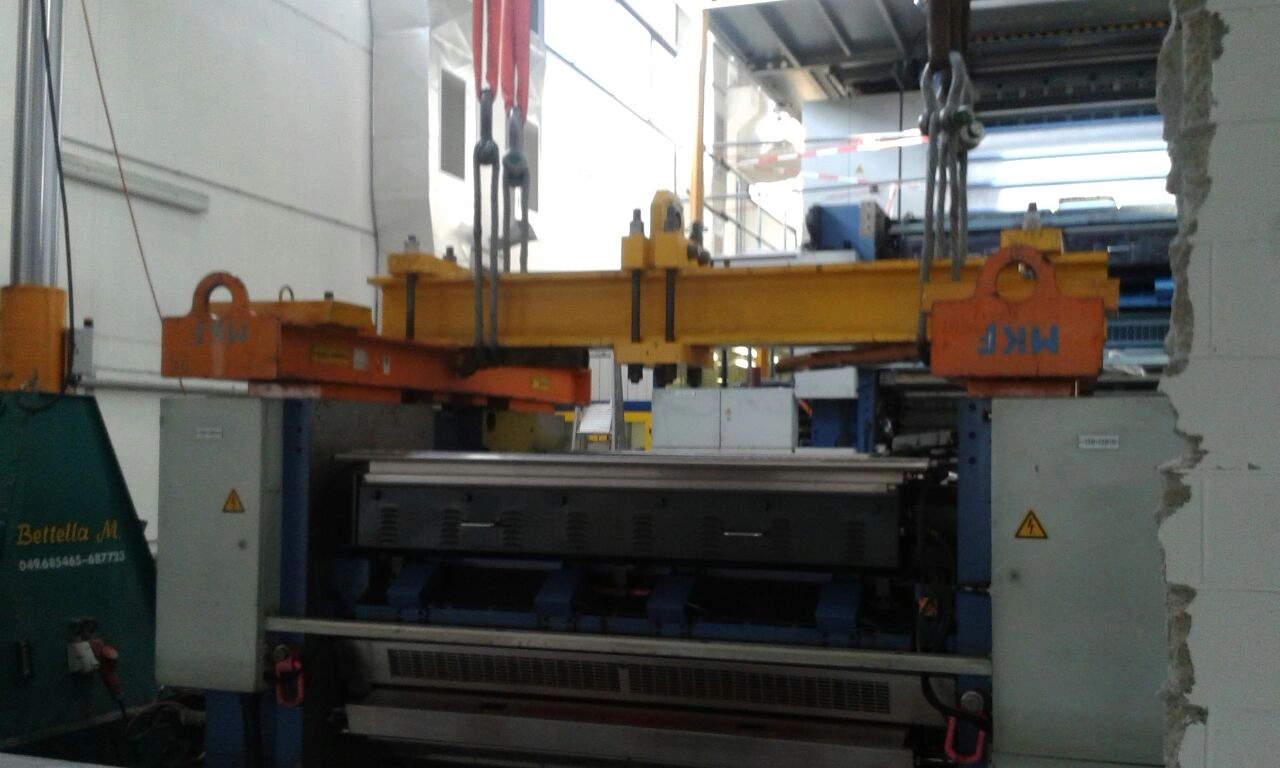 Scarico con gru, inoltro e posizionamento con rulliere elettriche telecomandate Apollo 50. Preparazione per inoltro con gru attraverso un varco sul muro, aperto appositamente per il passaggio della macchina. Istallazione dei gruppi con sollevameto tramite cavallette idrauliche e bilancini dedicati. Montaggio dei gruppi stampa e allineamento e posizionamento pre-avvio della maccina.