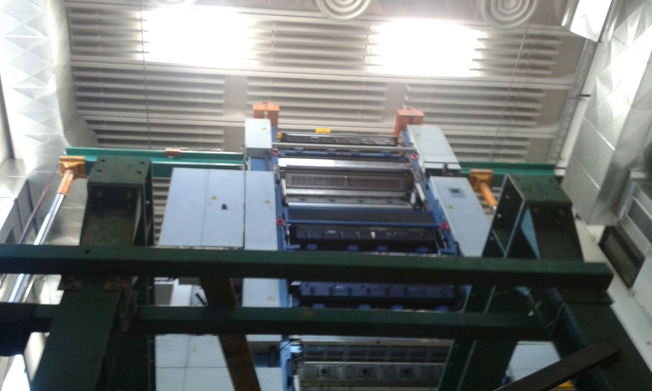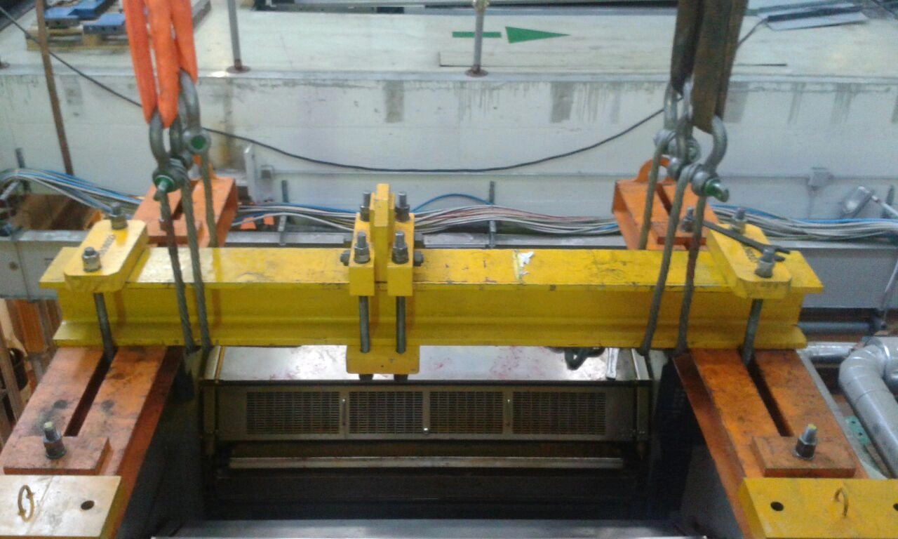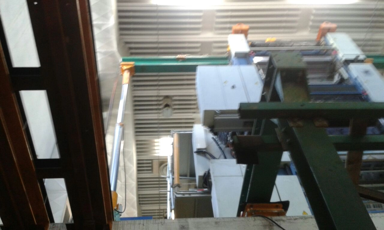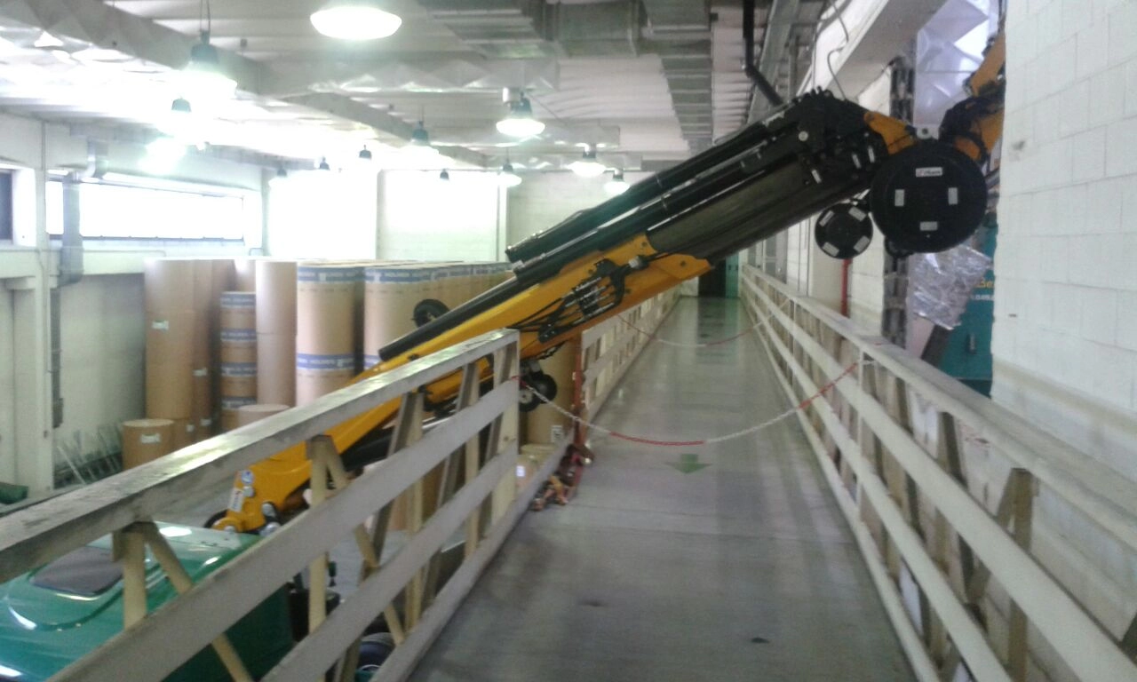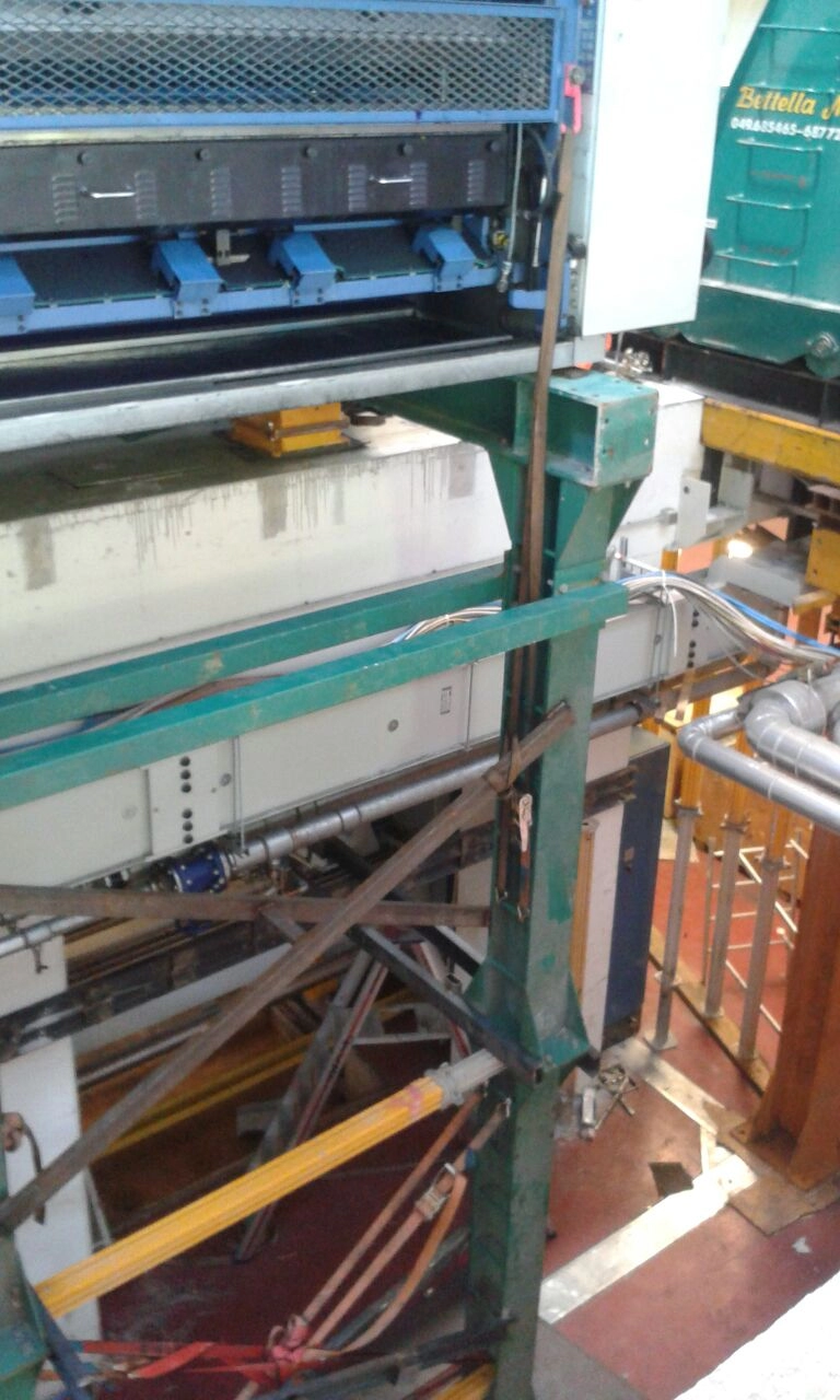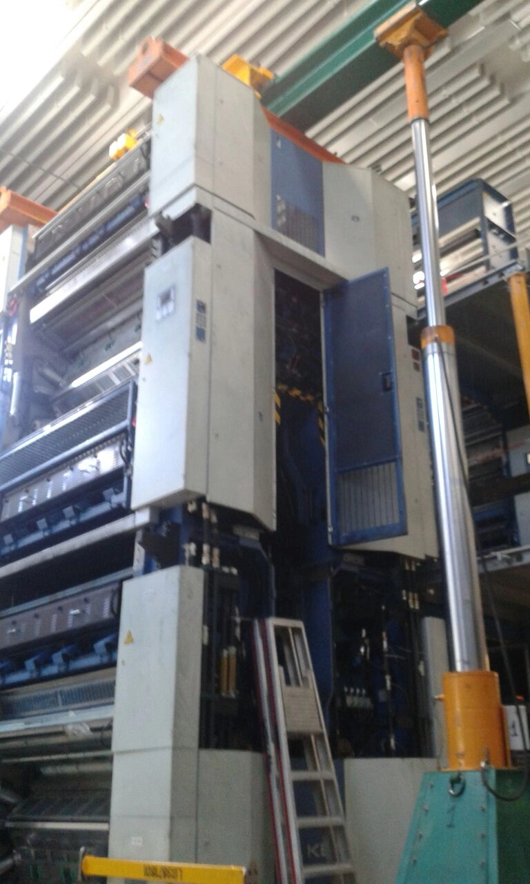 Scarico con gru, inoltro e posizionamento con rulliere elettriche telecomandate Apollo 50. Preparazione per inoltro con gru attraverso un varco sul muro, aperto appositamente per il passaggio della macchina. Istallazione dei gruppi con sollevameto tramite cavallette idrauliche e bilancini dedicati. Montaggio dei gruppi stampa e allineamento e posizionamento pre-avvio della maccina.