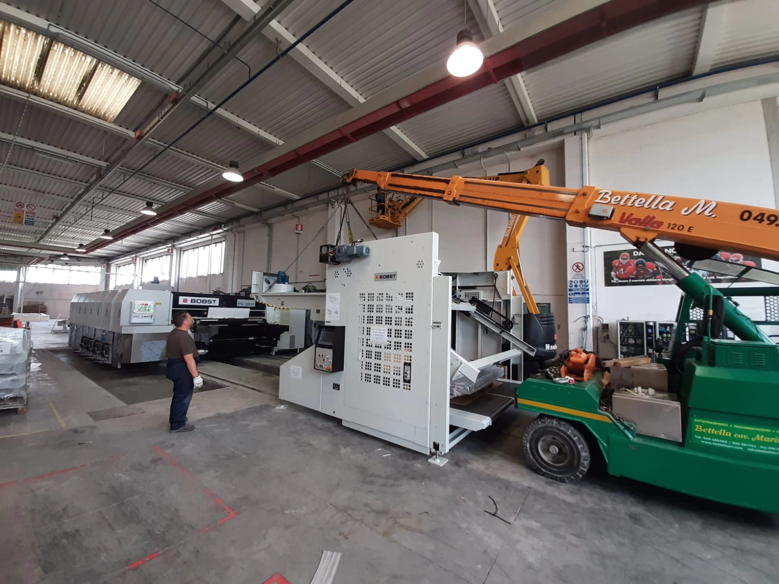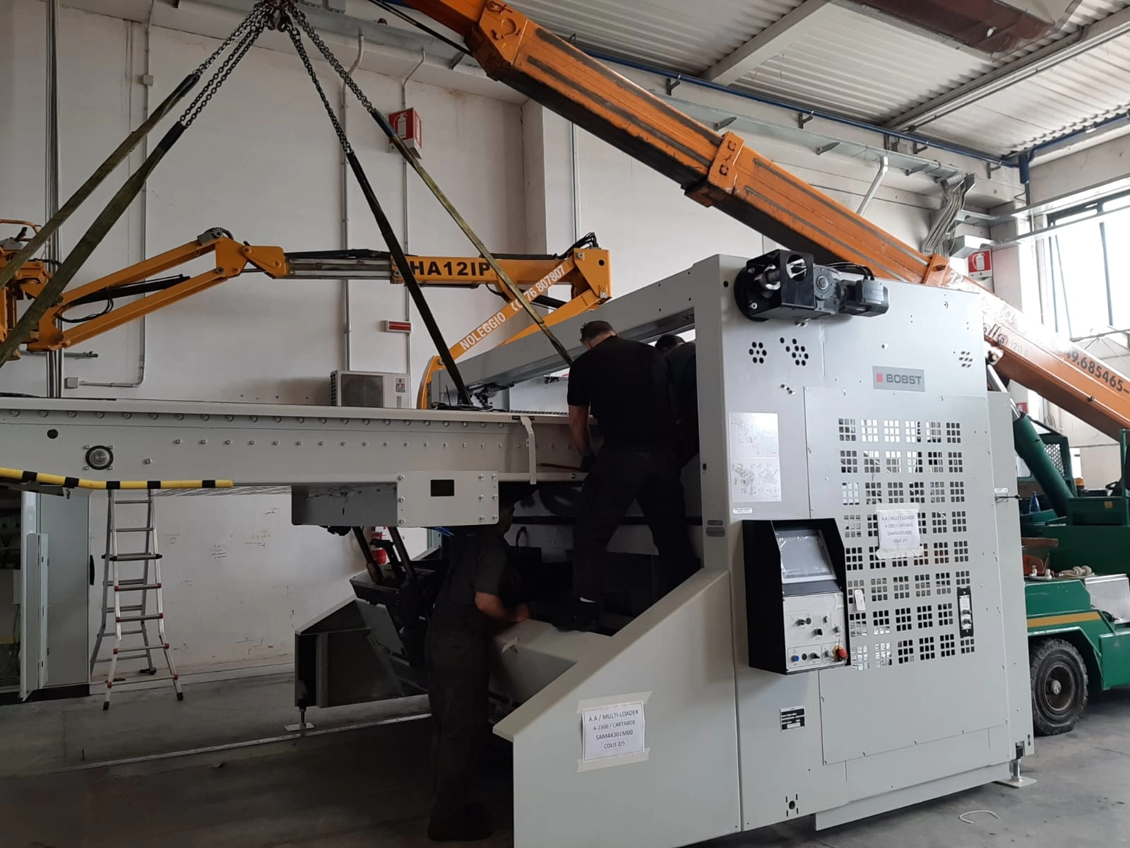 Montaggio di una linea per stampa su imballaggi BOBST con gru elettriche
