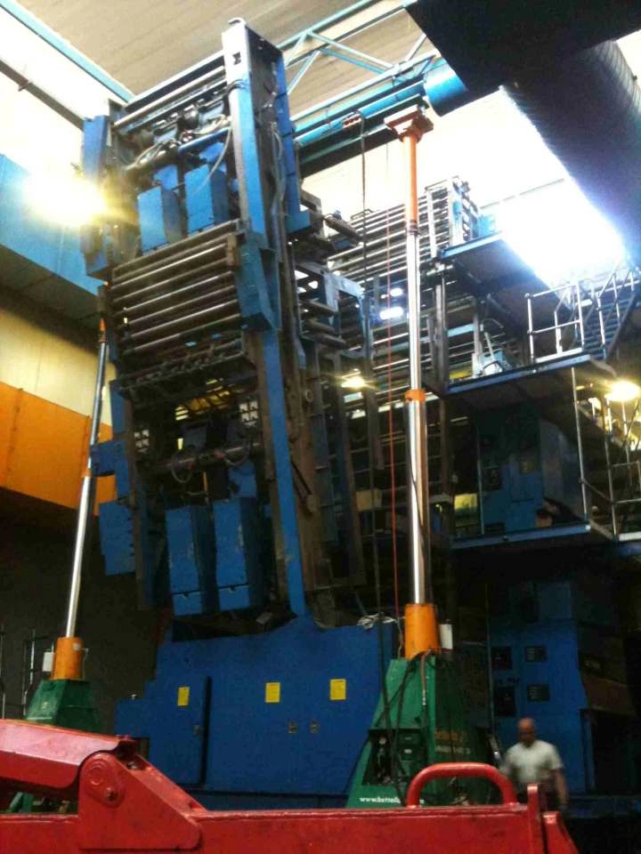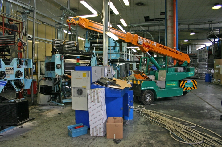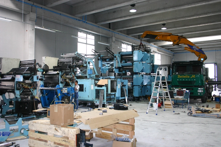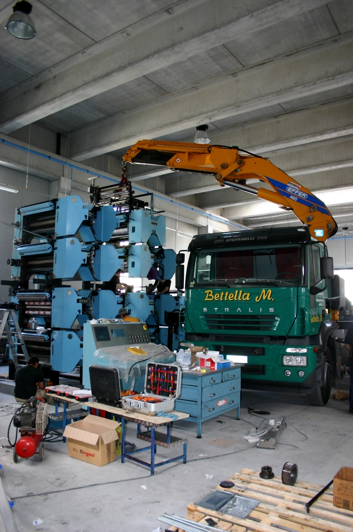 Smontaggio nella vecchia sede e trasferimento presso nuova sede, di una macchina GOSS composta da gruppi. Montaggio completo e posizionamento con cavallette idrauliche. Squadre di meccanici ed elettricisti impiegate per la preparazione all’avviamento della macchina.